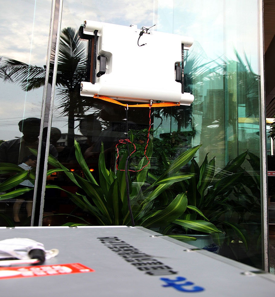 “玻璃幕墻無損檢測機器人”按指令向上爬行檢測幕墻